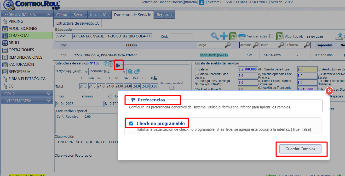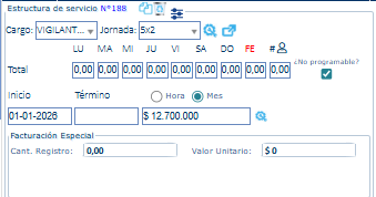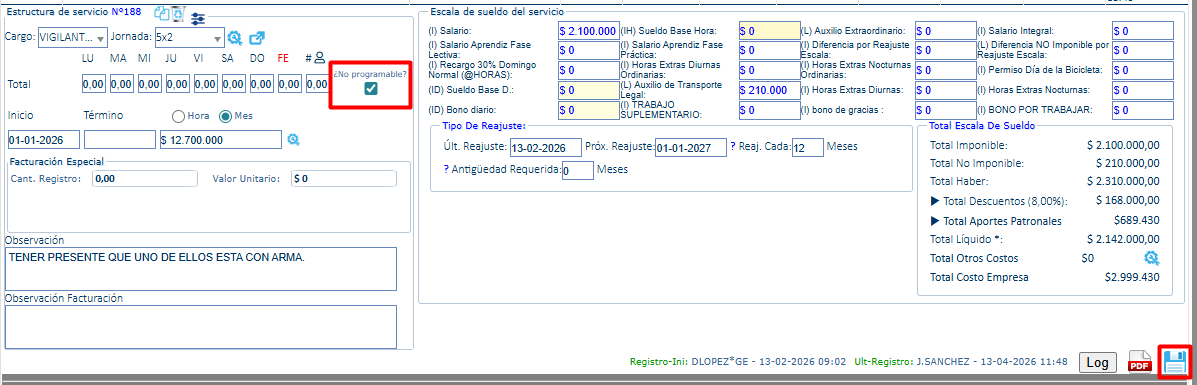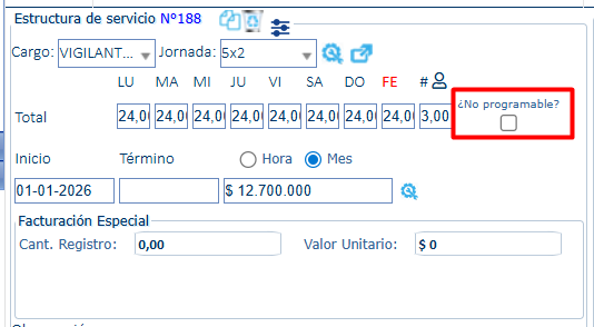 Este check permite controlar las estructuras que son de servicios no propios de vigilancia como por ejemplo monitoreos de alarmas. Una vez marcado el check “¿No Programable?” Se deben guardar cambios en la estructura de servicio para que se considere dicha funcionalidad.