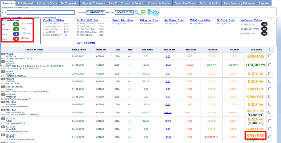 En Módulo Operaciones > tablero resumen ya no aparecerán las estructuras en los contadores de la vista por cliente pero debes tener en cuenta que en el listado con el detalle de CECOS si aparece ya que debemos reportar las estructuras completas de un CECOS. Con lo anterior, el registro del CECOS con esta condición de “¿No Programable?” activa, se visualizará en la columna “% Control” con la descripción “SIN/ESS”.