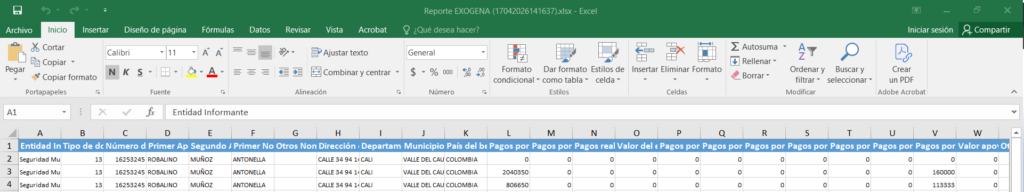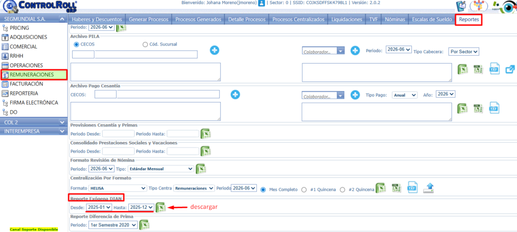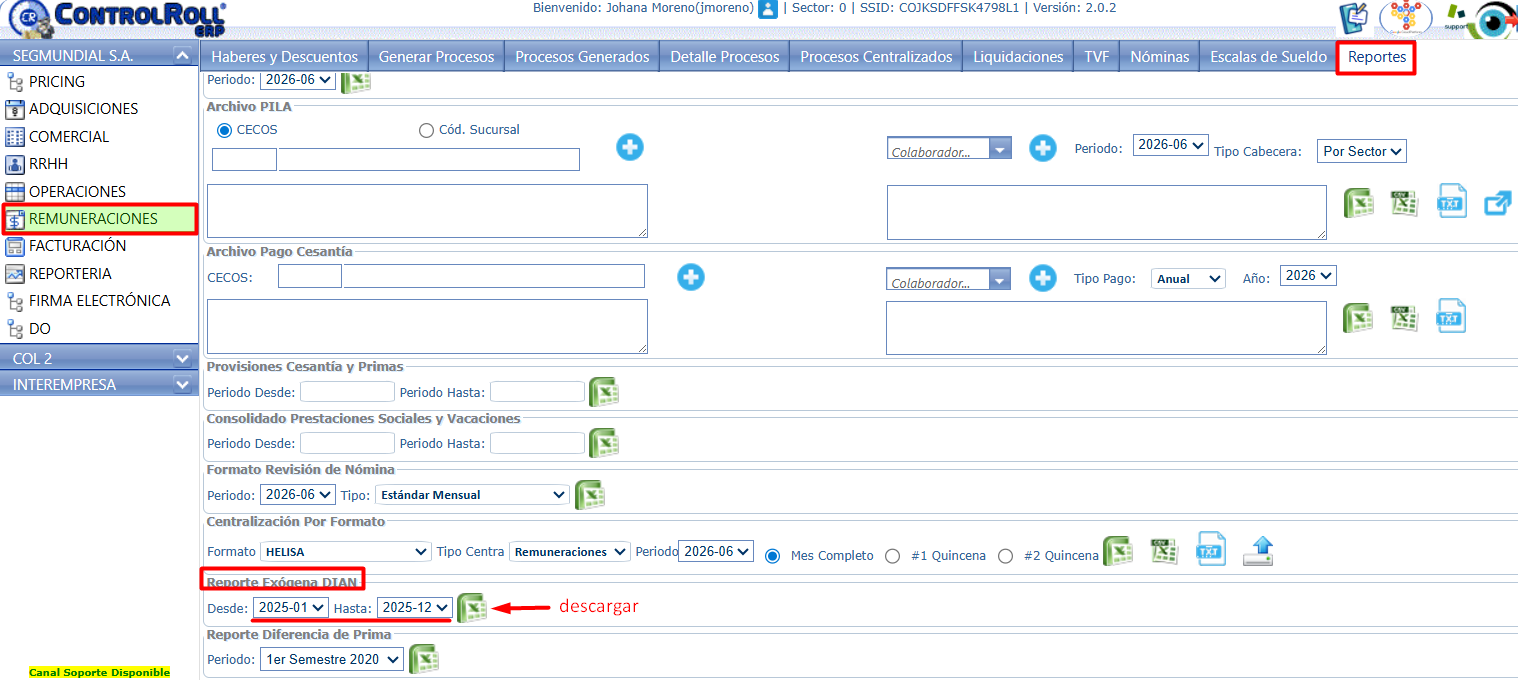 Este reporte se puede descargar desde el Módulo Remuneraciones > Tablero Reportes > Sección Reporte Exógena Dian , allí se deben ingresar los periodos que se requieran para su visualización, en este caso sería año completo, ejemplo: Desde 2025-01 hasta 2025-12 y dar clic en el icono de Excel para su descarga.