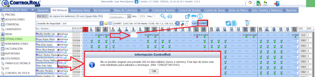 Se realiza un ajuste a la jornada 2×5 (40 bis A) la cual queda reservada exclusiva para turnos en días sábados, domingos y festivos, pudiendo planificar solo en los días indicados, de lo contrario, si intenta realizar alguna planificación de turnos con horas de trabajo mayor a cero en algún día que no corresponde, aparecerá la siguiente excepción.