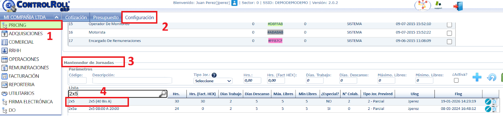 también pueden visualizarlo en el mantenedor de jornada del módulo pricing o comercial.