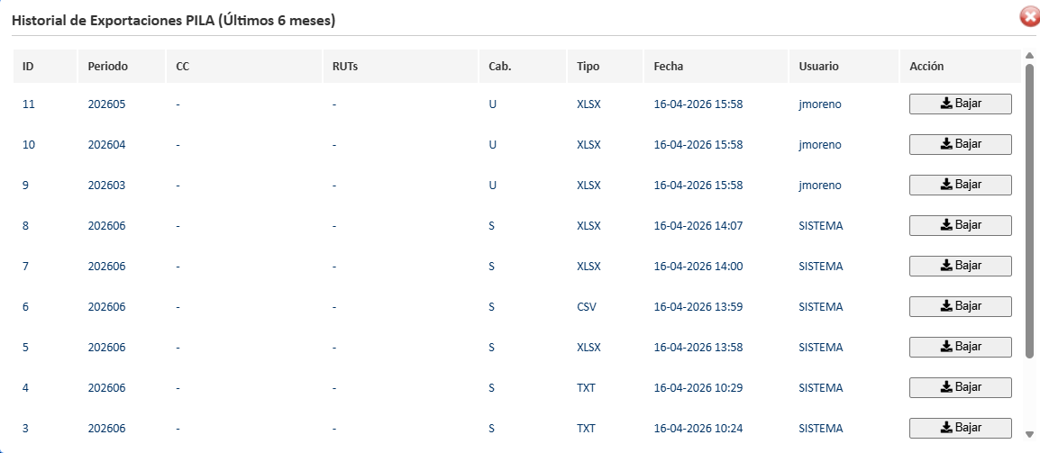 En pro de llevar un seguimiento y auditoría del proceso de descarga de planos TXT de PILA (Seguridad social), se crea nueva funcionalidad, la cual permite llevar un historial de descargas de planos según tipo de formato: TXT, EXCEL y CSV de pila.