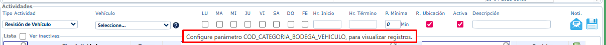Para ello, en primera instancia será necesario tener creada una categoría en bodega asociada a vehículos, la cual deberá a su vez configurarse en el parámetro COD_CATEGORIA_BODEGA_VEHICULO, para que estos sean visibles en este listado de vehículos.
