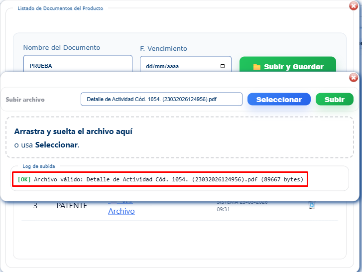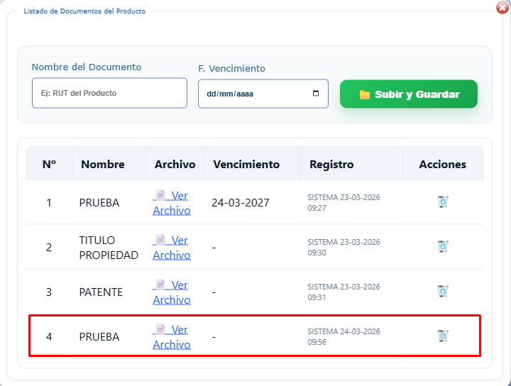 Al realizar esto, se visualizará este en el listado de documentos del producto, donde se podrá visualizar el nombre, archivo cargado, fecha de vencimiento, log de registro (ulog y flog), además de la posibilidad de eliminar este documento, presionando el ícono de la papelera.