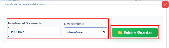 Donde deberán indicar un nombre del documento y/o fecha de vencimiento según corresponda (en caso de que no aplique, se debe dejar en blanco esta información), una vez realizado esto, deberán presionar “Subir y Guardar”.