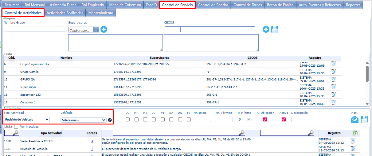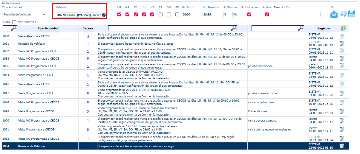 Se incorpora nueva funcionalidad en el control de servicio para los tipos de actividades “Revisión de Vehículo”, en las cuales se agrega un nuevo campo con el nombre “Vehículo”, para agregar estos a la configuración.