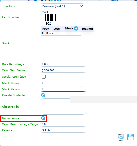 Junto con esto, también se habilita en el módulo de Facturación, tablero bodegas, en la información del ítem, la posibilidad de cargar documentos a este, haciendo clic en el ícono del engranaje que se visualiza en el campo “Documentos”