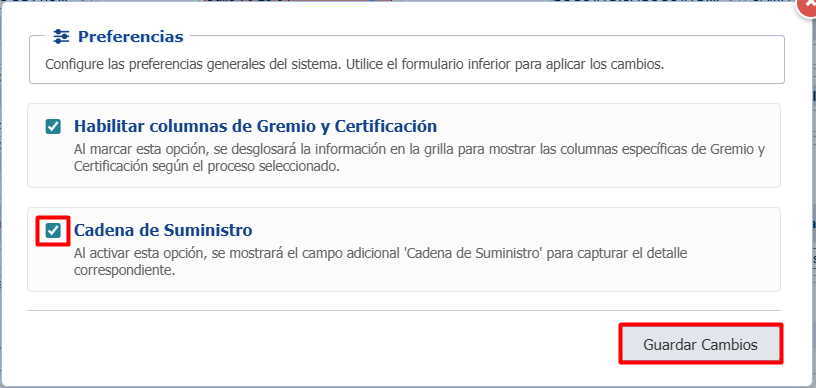 La cual se habilita dando click en la preferencia, se abre una ventana emergente donde se debe seleccionar la opción de cadena de suministro y guardar