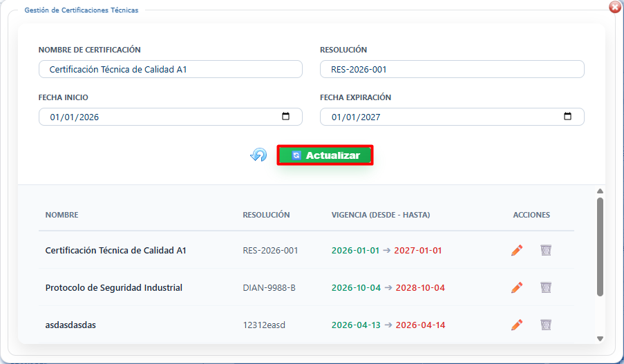 Editar: Al editar los campos deseados se deberá seleccionar Actualizar y se confirmará si el gremio o Certificación se actualizó correctamente.