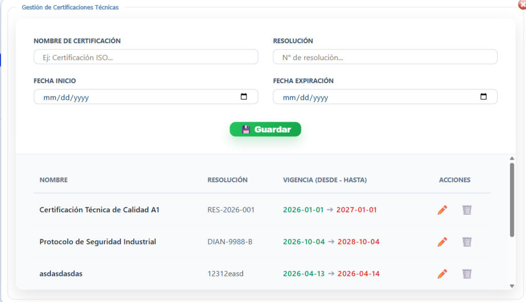 También se encontrará el listado de los registros ya ingresados en la parte inferior de la ventana, donde tienen la opción de editar o eliminar: