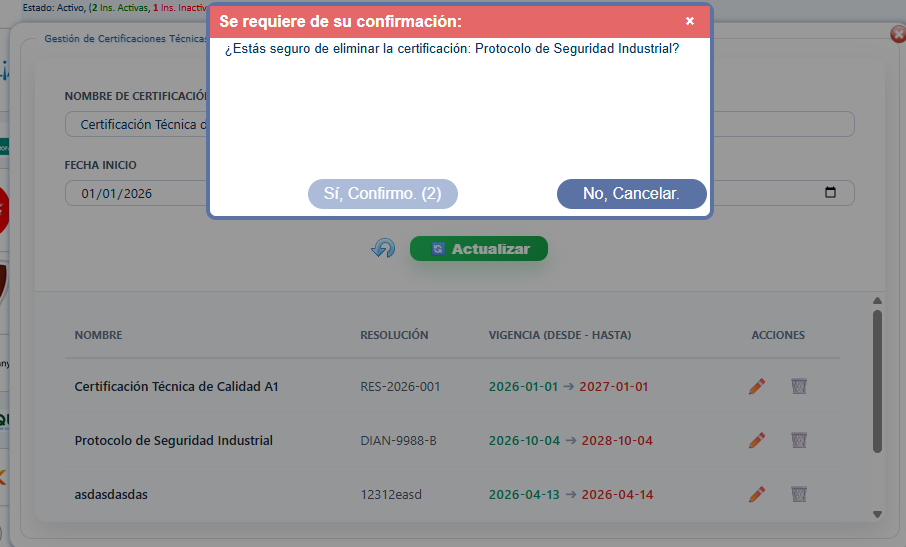 Eliminar: Para confirmar la eliminación debe esperar 3 segundos para que el botón de “Sí, Confirmó” se habilite.