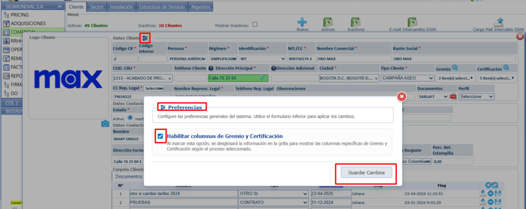 Se realiza mejora en Modulo Comercial > Tablero Clientes > Ficha Cliente con la posibilidad de configurar nueva preferencia haciendo clic en el botón , con el cual se abrirá una ventana emergente que te preguntará si deseas activar la nueva funcionalidad, si marcas el check y luego guardar cambios se activará este funcionamiento que ingresa dos nuevos campos autogestionables en la ficha del cliente, en el módulo comercial.
