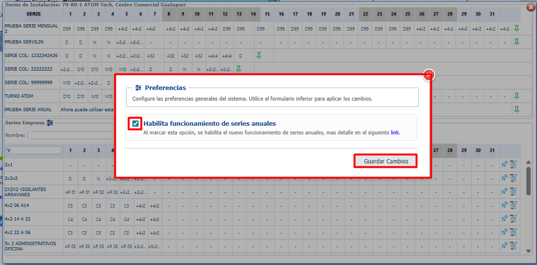 Se realiza mejora en Módulo Operaciones> Tablero Rol mensual> Gestionar series, para configuración de preferencias haciendo clic en el botón