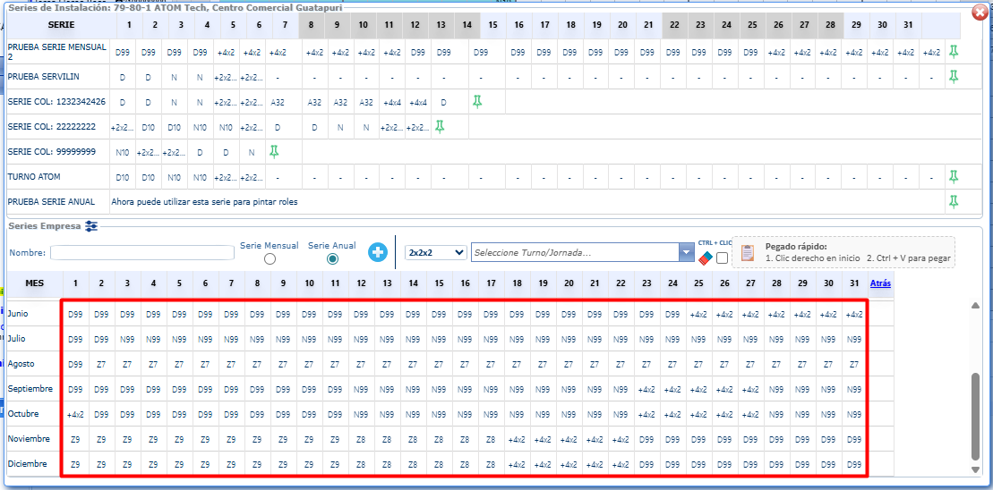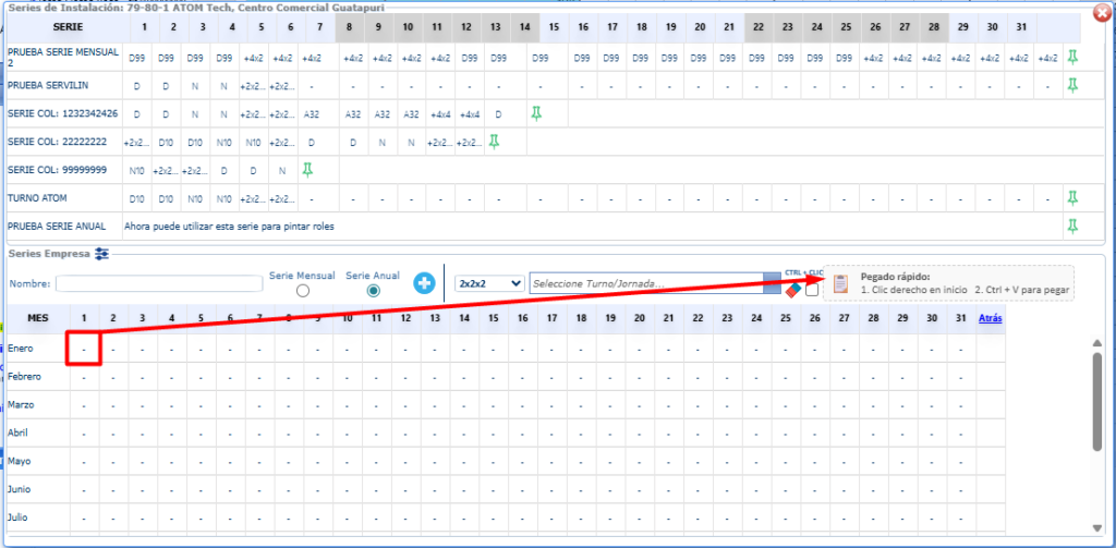 Este abrirá los meses de la serie, aquí se copian desde el excel los turnos y se ubican en el primer turno, luego deberás hacer clic derecho y pegar.