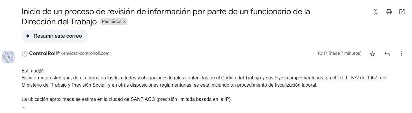 “Se informa a usted que, de acuerdo con las facultades y obligaciones legales contenidas en el Código del Trabajo y sus leyes complementarias; en el D.F.L. Nº2 de 1967, del Ministerio del Trabajo y Previsión Social, y en otras disposiciones reglamentarias, se está iniciando un procedimiento de fiscalización laboral.”