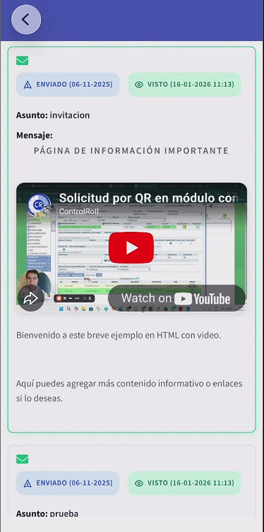 Si tienes algún mensaje, al seleccionar esta opción con registros visualizarás el detalle de estos con la fecha en que fue enviado por tu empleador, la fecha en la que fue visto por ti en tu portal y el mensaje recibido. Para volver atrás a la pantalla anterior podrás presionar el botón .