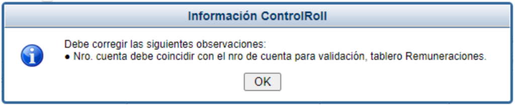 Para el caso del Tablero Remuneraciones de la ficha, se crea un nuevo campo Repetir No. Cuenta, el cual tiene el mismo funcionamiento del campo anterior, es decir, servirá para confirmar el dato ingresado en campo correspondiente al número de cuenta, por lo cual el sistema generará un mensaje al momento de guardar y sólo hasta hacer esa corrección les permitirá guardar la ficha del colaborador.