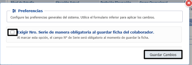 En la ventana emergente de Documentos de Identidad, encontrará el ícono de Preferencias . Al seleccionarlo, se abrirá una nueva ventana donde se visualizará el funcionamiento:“Exigir Nro. Serie de manera obligatoria al guardar ficha del colaborador”.