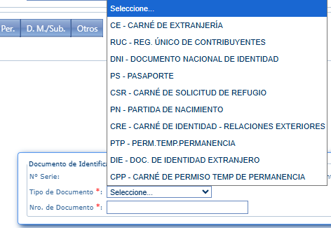Al ingresar a la ficha del colaborador, en el campo Número de Documento de Identificación encontrará un ícono de selección . Al hacer clic en este, se abrirá una ventana emergente donde podrá visualizar los distintos tipos de documentos disponibles en el sistema.