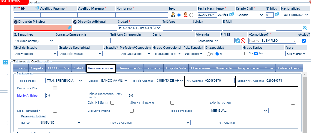 Validación Campos Cedula y Cuenta Bancaria Ficha del Colaborador